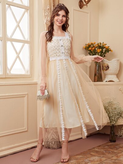 SHEIN Square Neck Guipure Lace Panel Mesh Dress