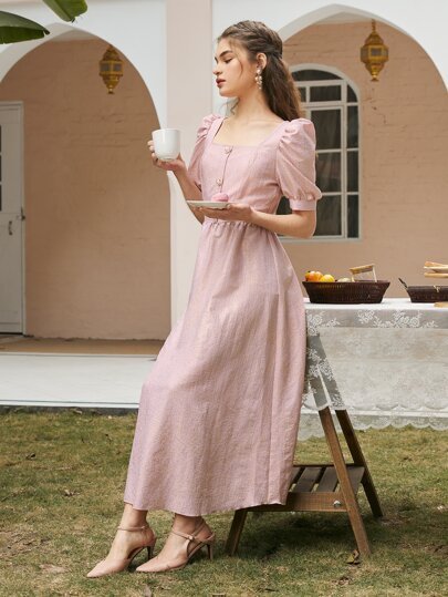 SHEIN Square Neck Puff Sleeve Pearls Button Front Dress