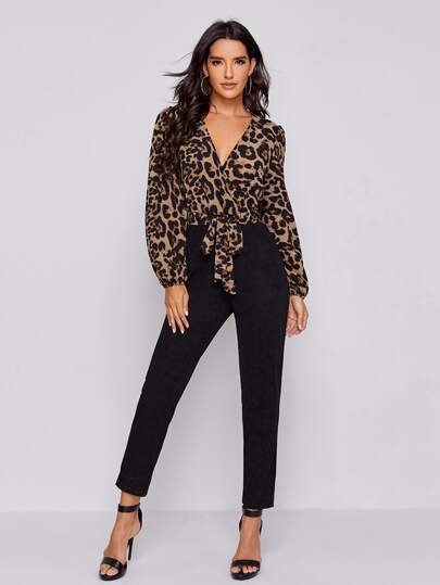 SHEIN Surplice Neck Lantern Sleeve Self Belted Leopard Bodice Jumpsuit
