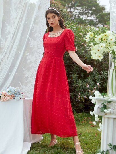 SHEIN Swiss Dot Square Neck Puff Sleeve A-line Dress