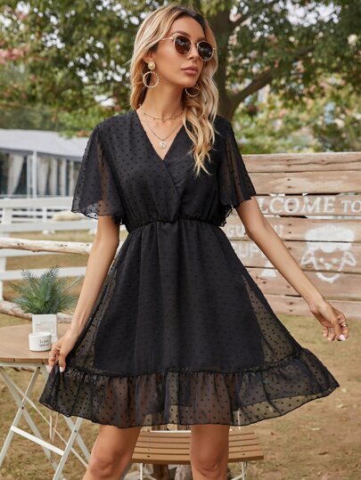 SHEIN Swiss Dot Surplice Front Ruffle Hem Dress