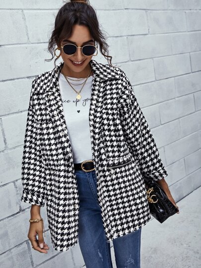 SHEIN Tweed Houndstooth Zipper Detail Button Up Coat