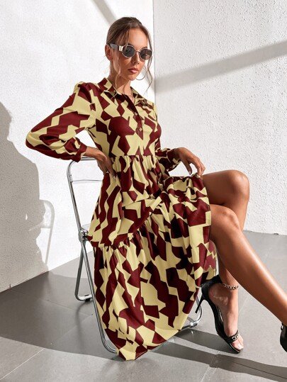 SHEIN Unity Geo Print Ruffle Hem Shirt Dress