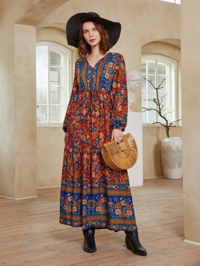 SHEIN V-Neck Floral Print A-Line Dress Maxi Women Outfit
