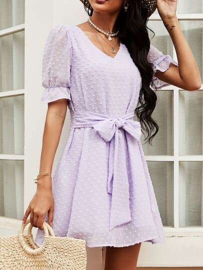 SHEIN V Neck Swiss Dot Belted Chiffon Dress