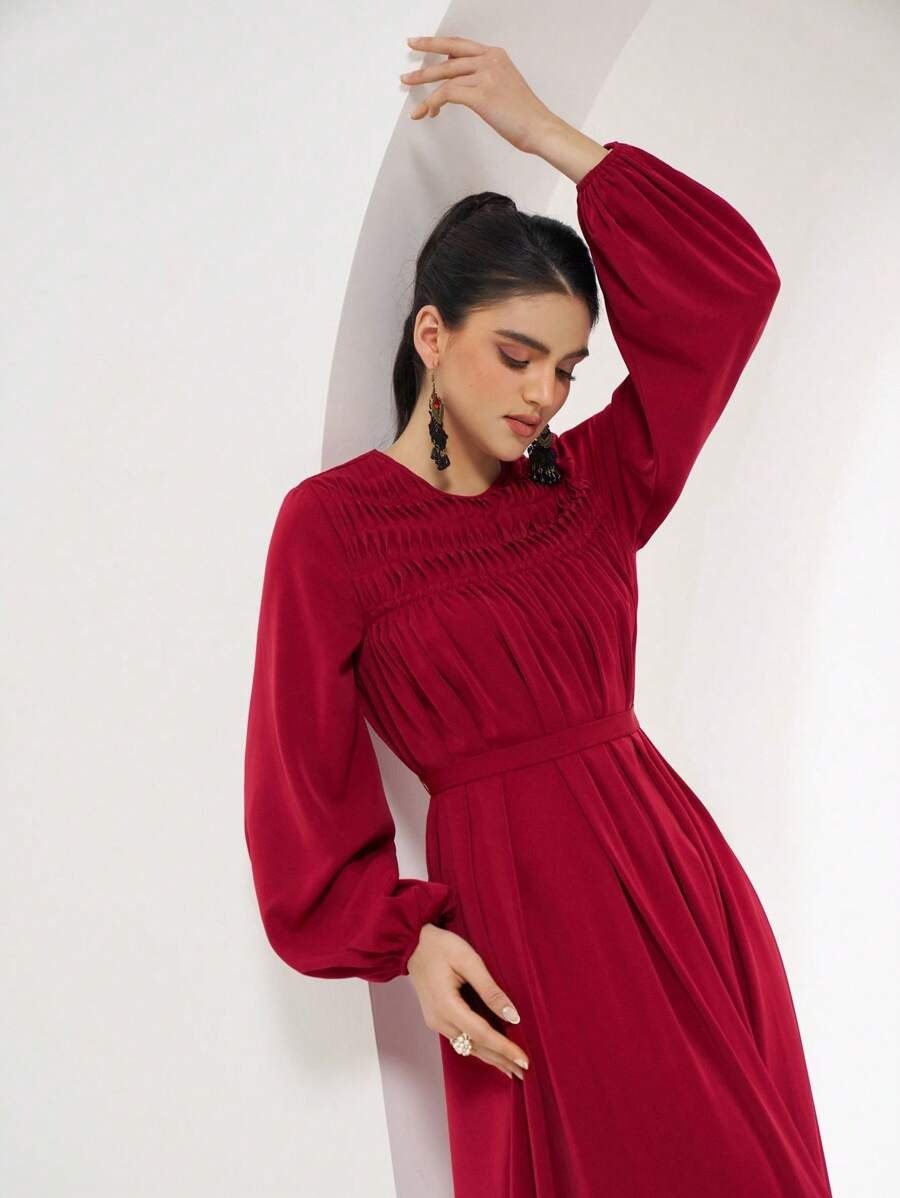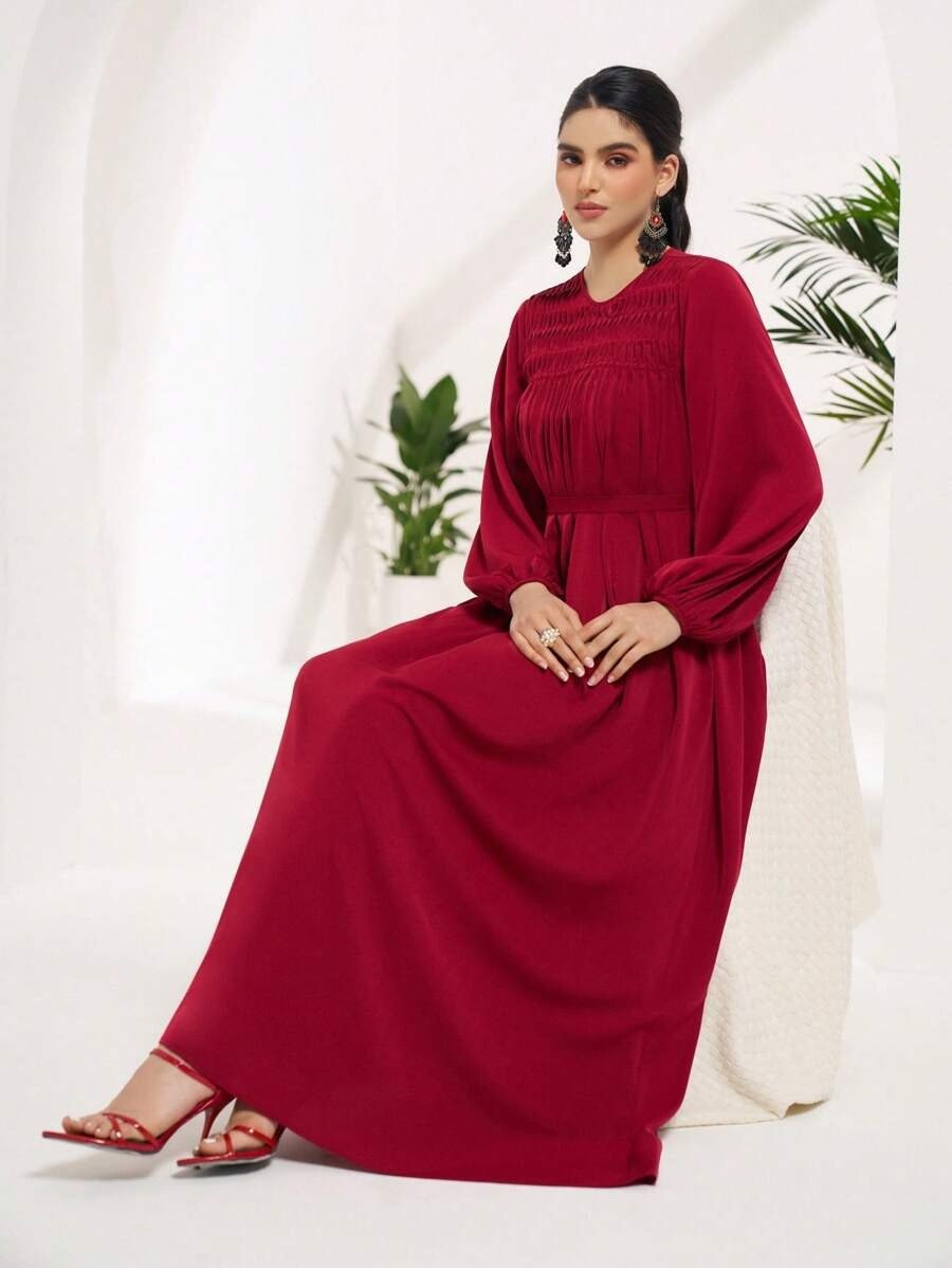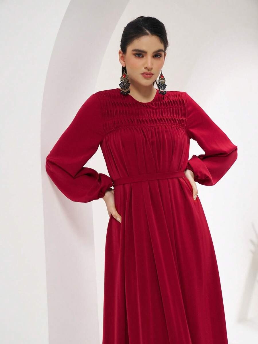 SHEIN Veilorie Women’s Solid Color Round Neck Lantern Sleeve Elegant Dress