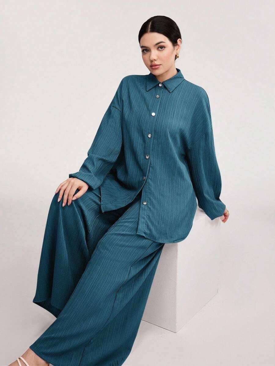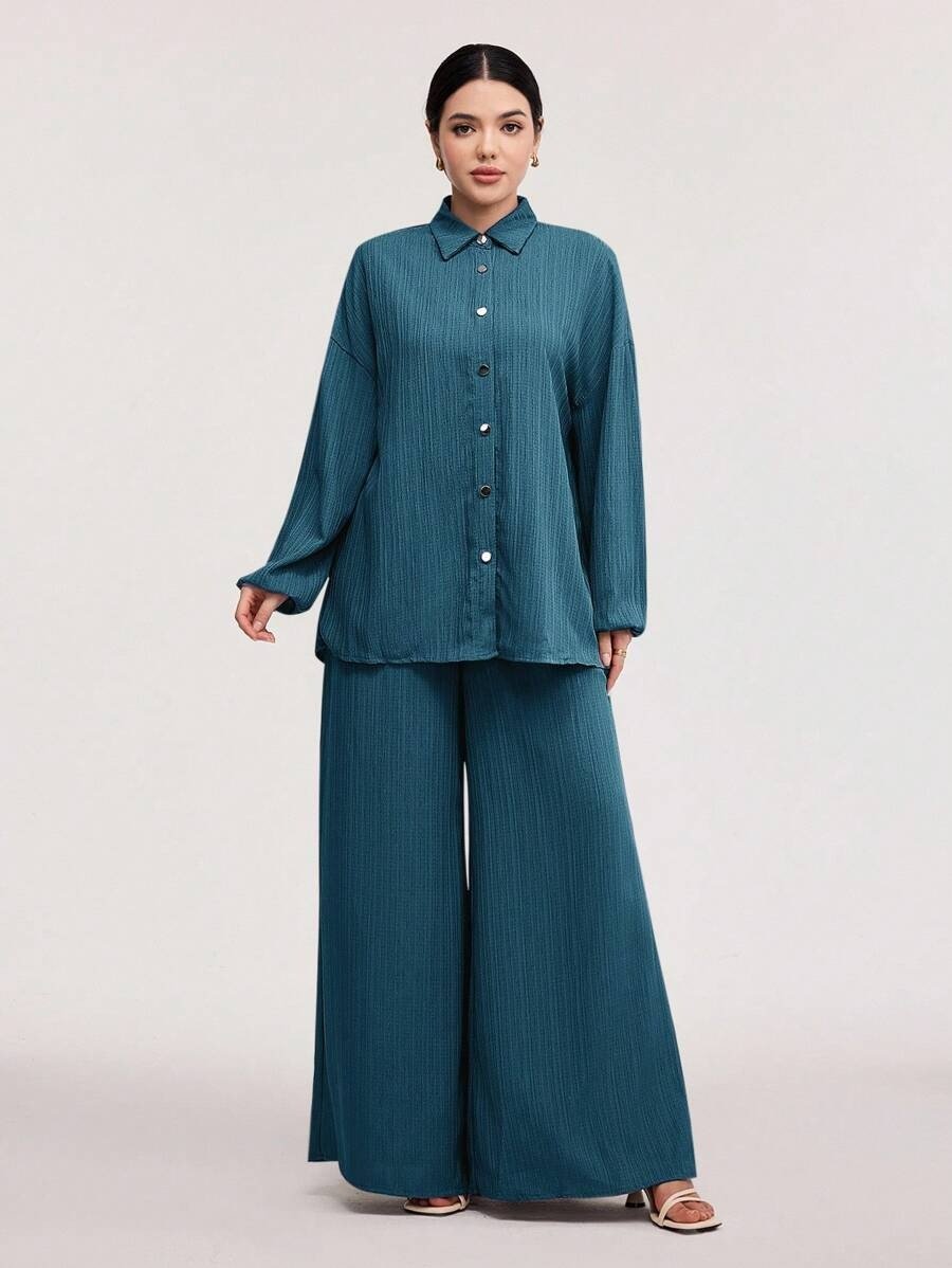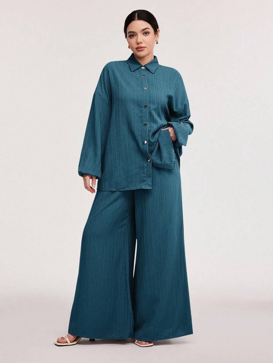 SHEIN Veilorie Women’s Spring/Summer Solid Color Drop Shoulder Lantern Sleeve Shirt And Pants Casual Suit 2 Pieces Set