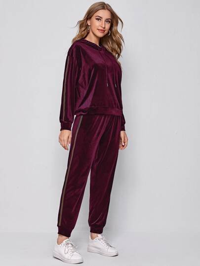 SHEIN Velvet Side Stripe Drawstring Hoodie With Sweatpants