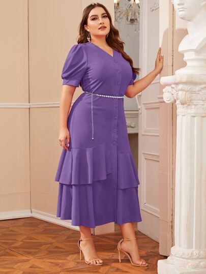 SHEIN Women Plus Size Puff Sleeve Button Front Layered Ruffle Hem Dress Without Belt