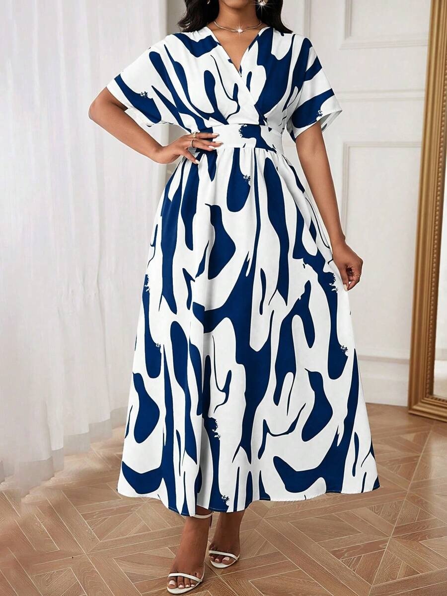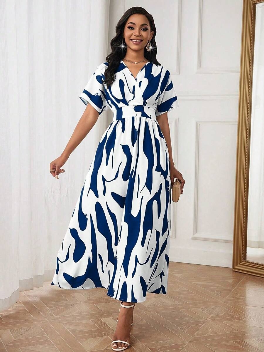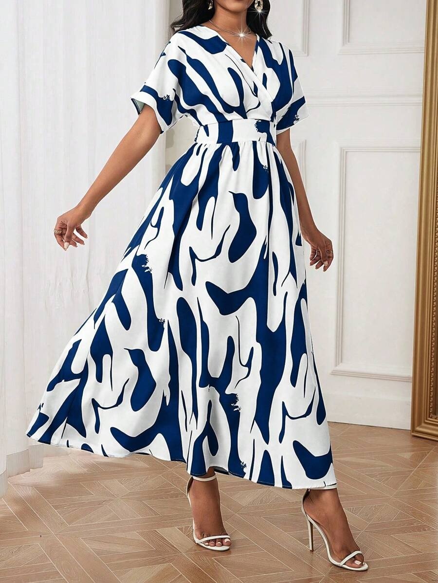 Women Spring Summer Casual Random Printed Batwing Sleeve Waist-Cinching Dress Maxi Women Outfit